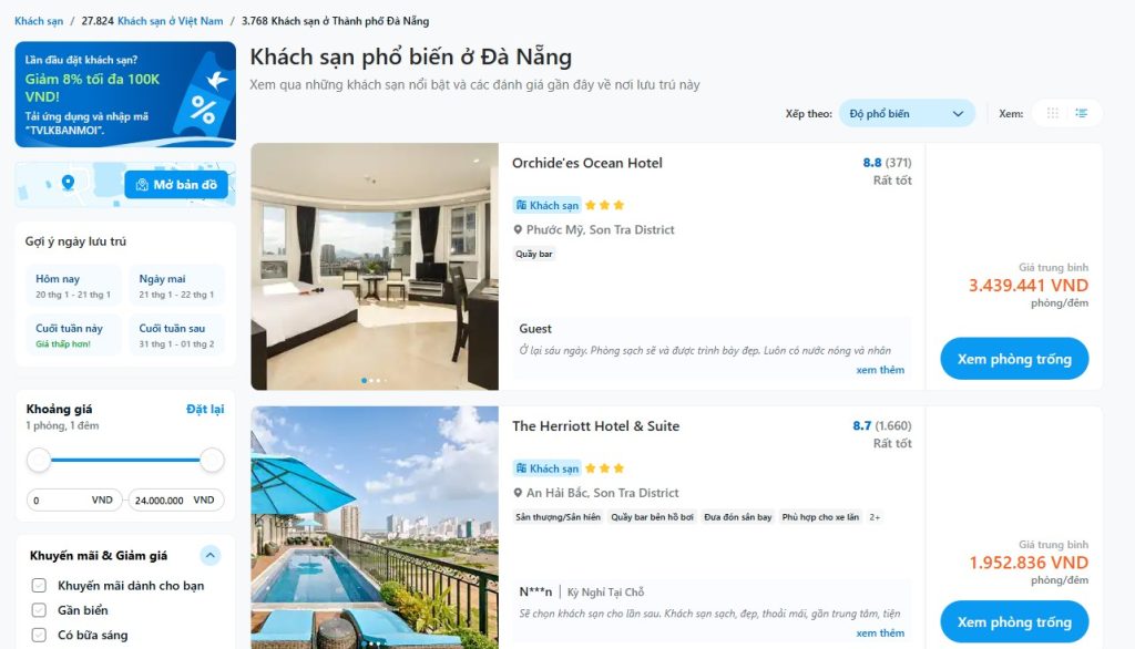 Tùy theo mục đích chuyến đi, bạn có thể lựa chọn khách sạn gần biển để nghỉ dưỡng hoặc khách sạn trung tâm để thuận tiện di chuyển, ăn uống và tham quan. Nhìn chung, mặt bằng giá phòng khách sạn Đà Nẵng khá linh hoạt, phù hợp với nhiều nhóm đối tượng du khách.